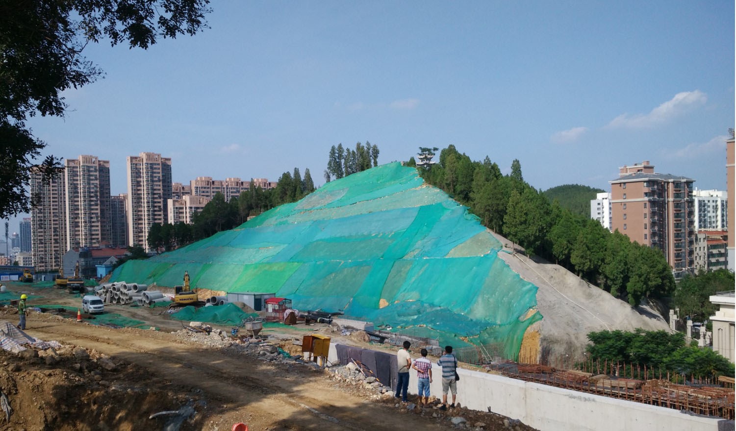 翠屏山工程邊坡位于濟南市二環(huán)東路沿線,千佛山風(fēng)景名勝區(qū)西臨,對重要道路地段的景觀有較大影響,同時也承擔(dān)了破損山體生態(tài)功能的需求。坡面為建設(shè)老虎山隧道,因隧道施工而形成的人工坡面,長137米,高29米,坡度39.6°,綠化面積3552平方米。原地形為三級平臺,每級平臺寬約2米,由于雨水侵蝕,有部分土石滑落的現(xiàn)象。項目在坡面排險的基礎(chǔ)上,采用生態(tài)袋、土工格室、植被毯等多修復(fù)方式結(jié)合的方法,選擇適宜的植物,對坡面進行植被重建,最終修復(fù)成一個集穩(wěn)固邊坡、生態(tài)修復(fù)、保持水土、景觀綠化等多功能為一體的綜合性邊坡,呈現(xiàn)出具有自然性和生態(tài)性的綠化景觀。