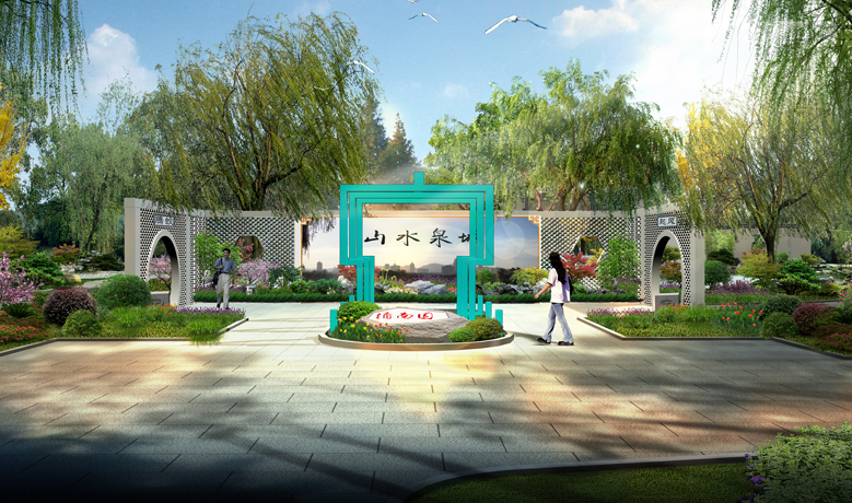 展園運(yùn)用傳統(tǒng)園林造景手法,融入現(xiàn)代設(shè)計元素,將柳樹、荷花、反映泉城景觀的壁畫、“泉”字符號及景門、疊石、水榭、石刻等融入園中,描繪了一幅悠然濟(jì)南的生態(tài)綠意畫卷。