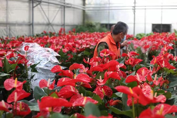 春節(jié)臨近,濟(jì)南百合花卉展銷市場百花齊放,喜迎新春,近百萬盆蝴蝶蘭、紅掌、大花惠蘭、杜鵑、君子蘭、寶蓮燈等上百種花卉爭奇斗艷,裝點(diǎn)千家萬戶,為即將到來的牛年增添喜慶氣氛。